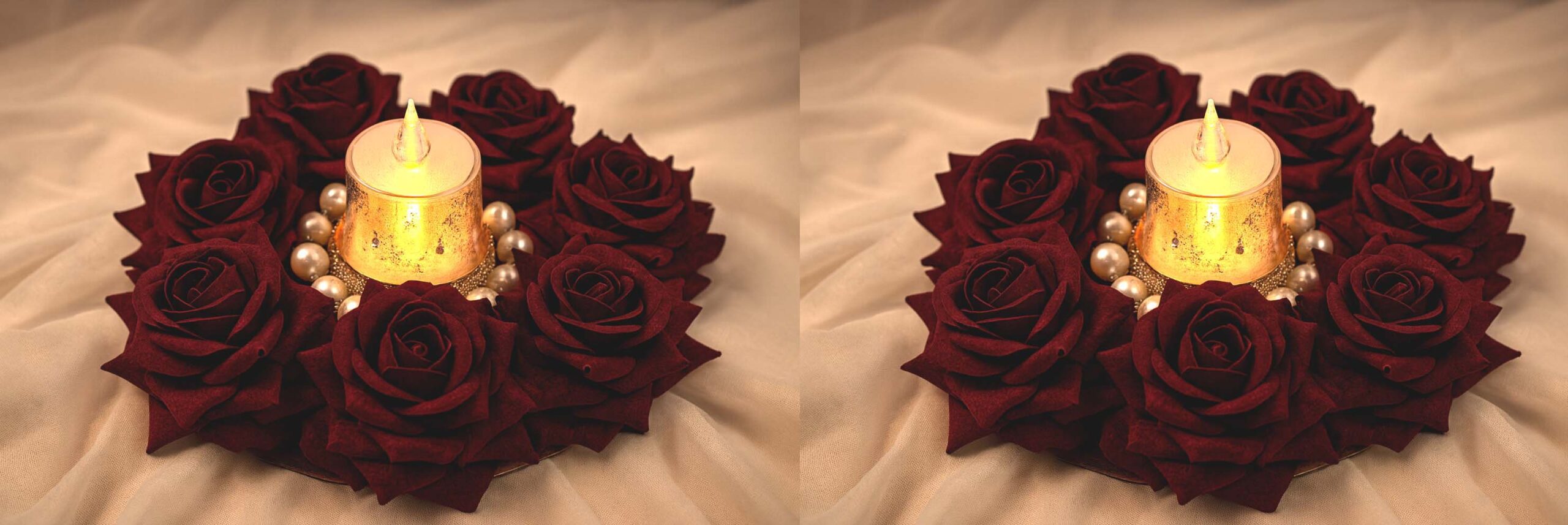 Each rangoli mat is thoughtfully designed with velvet-textured artificial roses arranged in a circular pattern. At the center, a tealight candle holder surrounded by pearls enhances the glow and radiance of your space. Simply place the mats at your entrance, pooja room, dining area, or living space to create a warm and welcoming atmosphere.