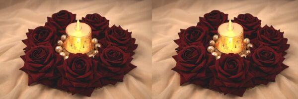 Celebrate your festivals and special occasions with elegance using this Handmade Artificial Rose Flower Rangoli Set with Tealight Candle Holders. Designed to add a touch of charm and sophistication to your home décor, this set includes 4 beautifully crafted rangoli mats, each adorned with deep maroon rose flowers and a central tealight holder.
