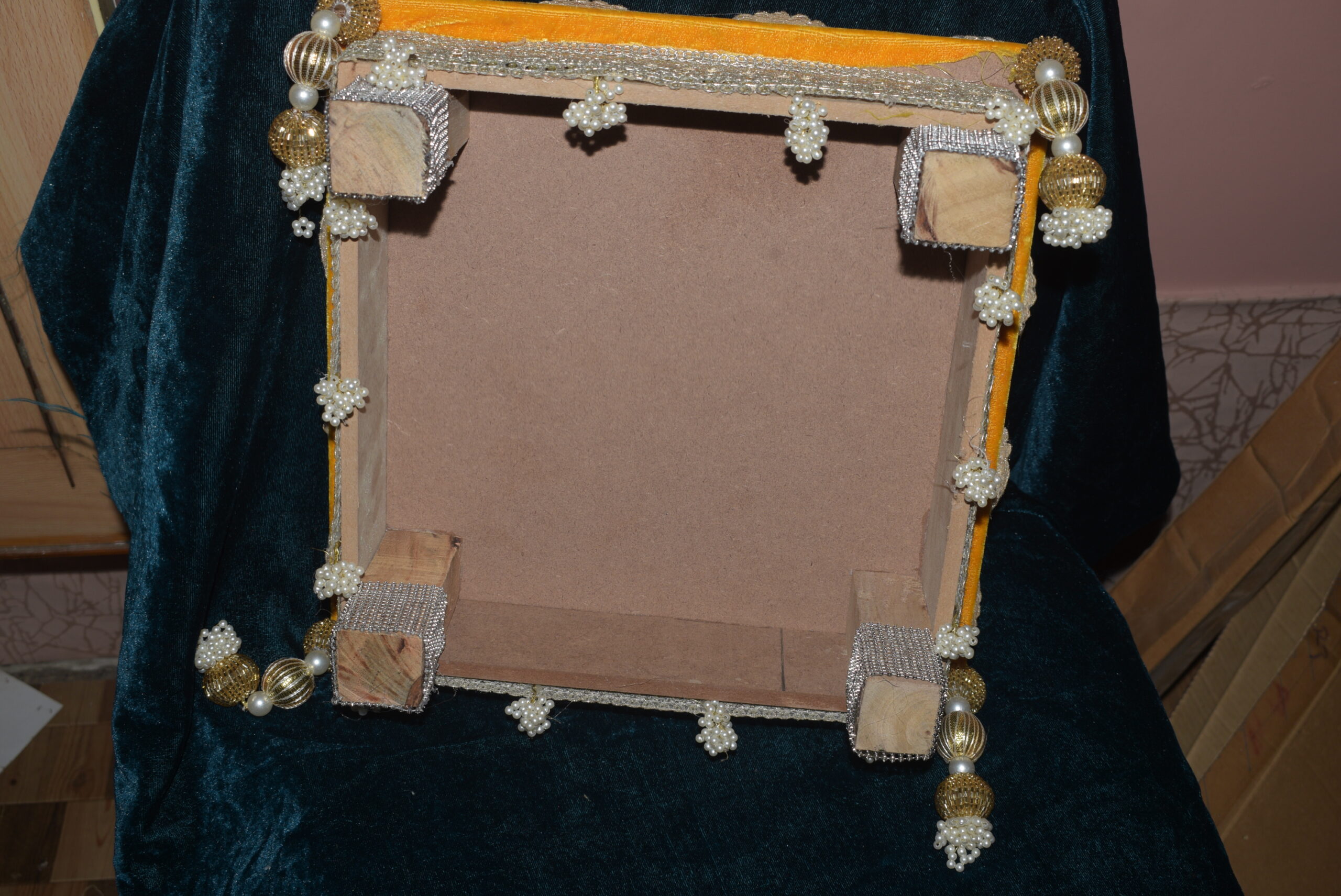 Wooden base puja chouki, decorative puja chowki with pearls, beads work pooja chowki, traditional puja platform, wooden altar for home temple, festive pooja accessories, wedding puja chouki