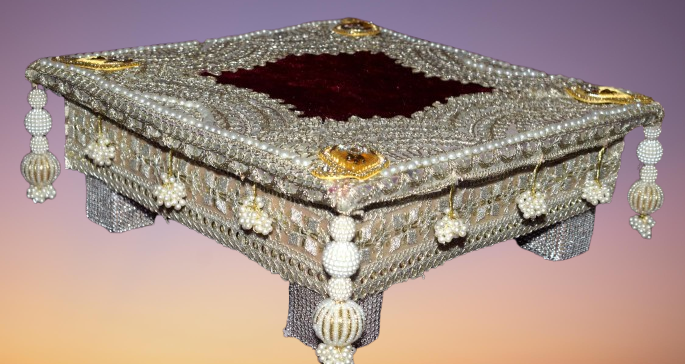 Crafted from a sturdy wooden base, this chouki ensures durability and strength while maintaining a refined, elegant look. The surface is carefully decorated with shimmering pearls, vibrant beads, and intricate designs, giving it a festive and luxurious finish. The detailing highlights the dedication of skilled artisans who create this piece with precision and devotion.