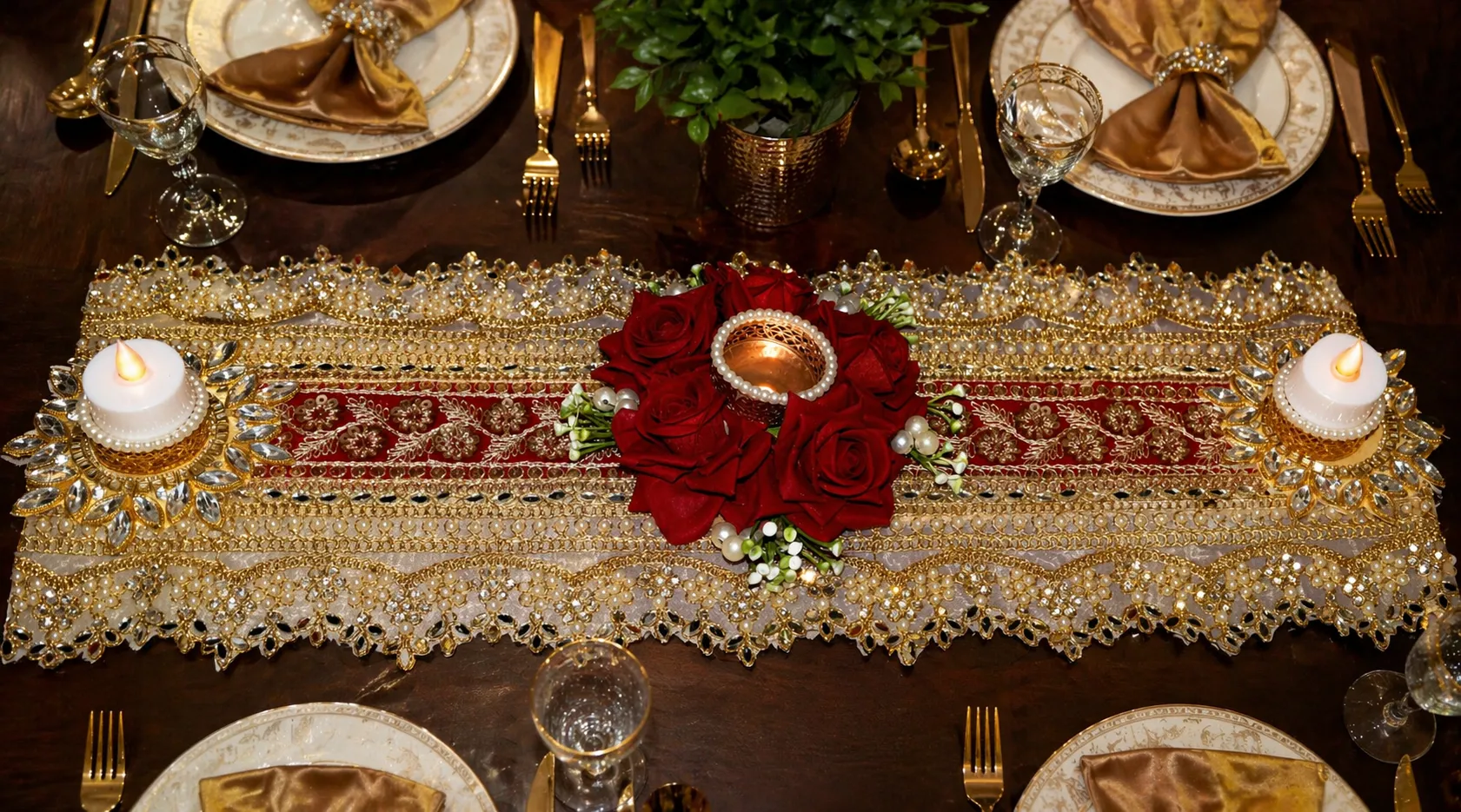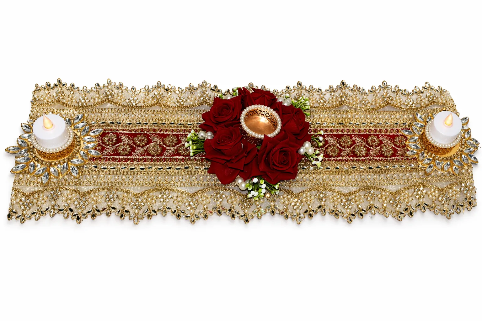 This premium handcrafted table runner adds a luxurious and elegant look to your dining table. Designed with intricate golden lace, red floral arrangement, and decorative candle holders, it enhances any festive or wedding setup.