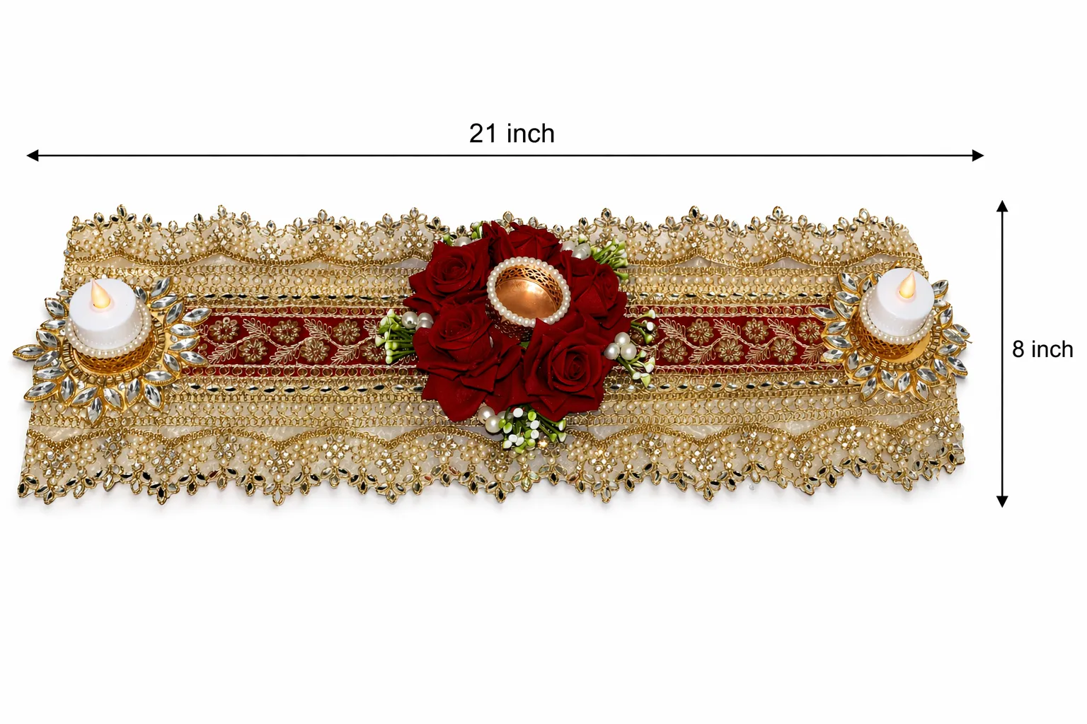 यह एक प्रीमियम हैंडमेड टेबल रनर है जो आपके घर और डाइनिंग टेबल को रॉयल और आकर्षक लुक देता है। इसमें खूबसूरत गोल्डन लेस वर्क, रेड फ्लोरल डेकोरेशन और कैंडल होल्डर शामिल हैं जो इसे खास बनाते हैं।