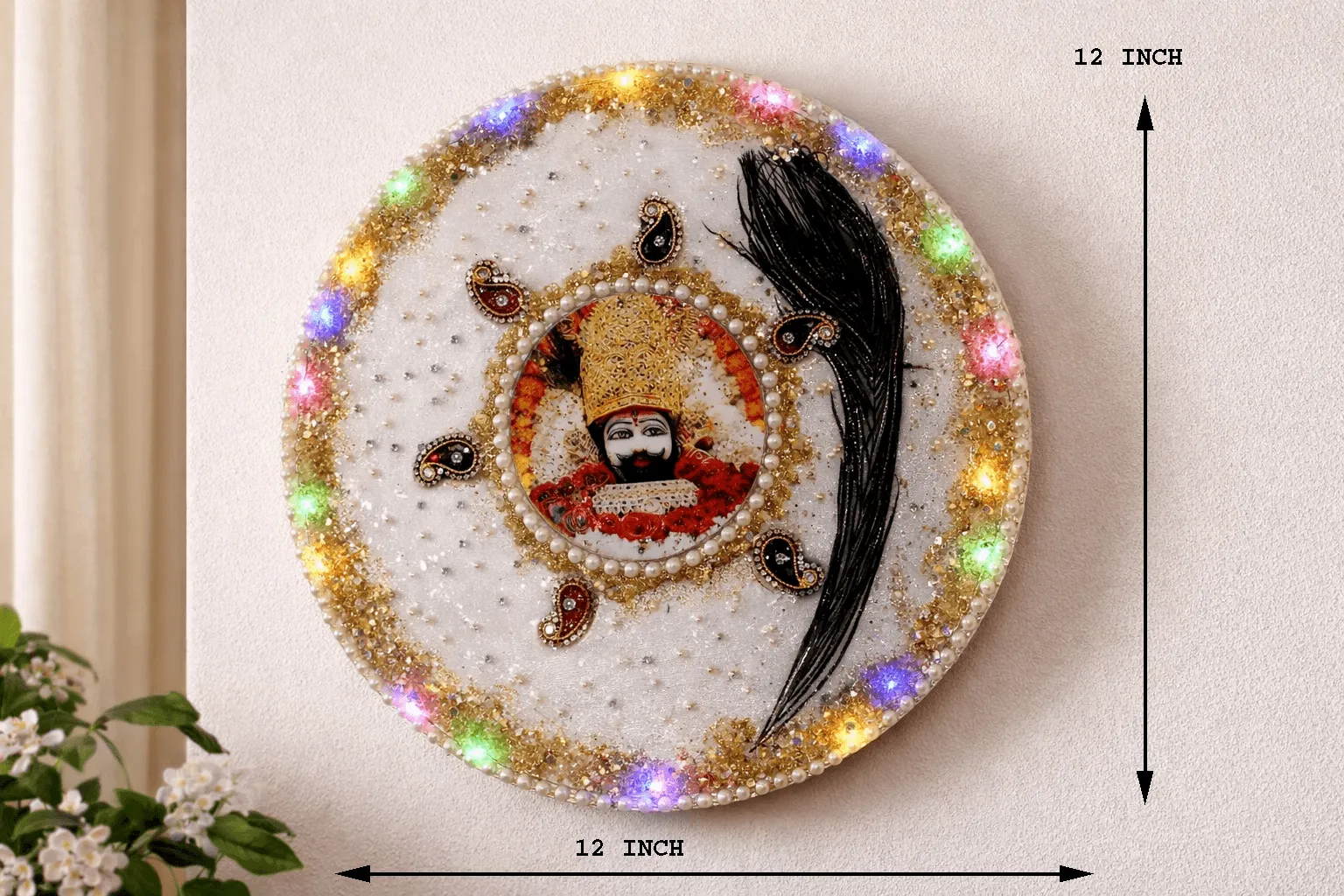 Khatu Shyam resin wall decor with LED lights, spiritual home decoration item. Perfect for temple decor, gifting and festive use.