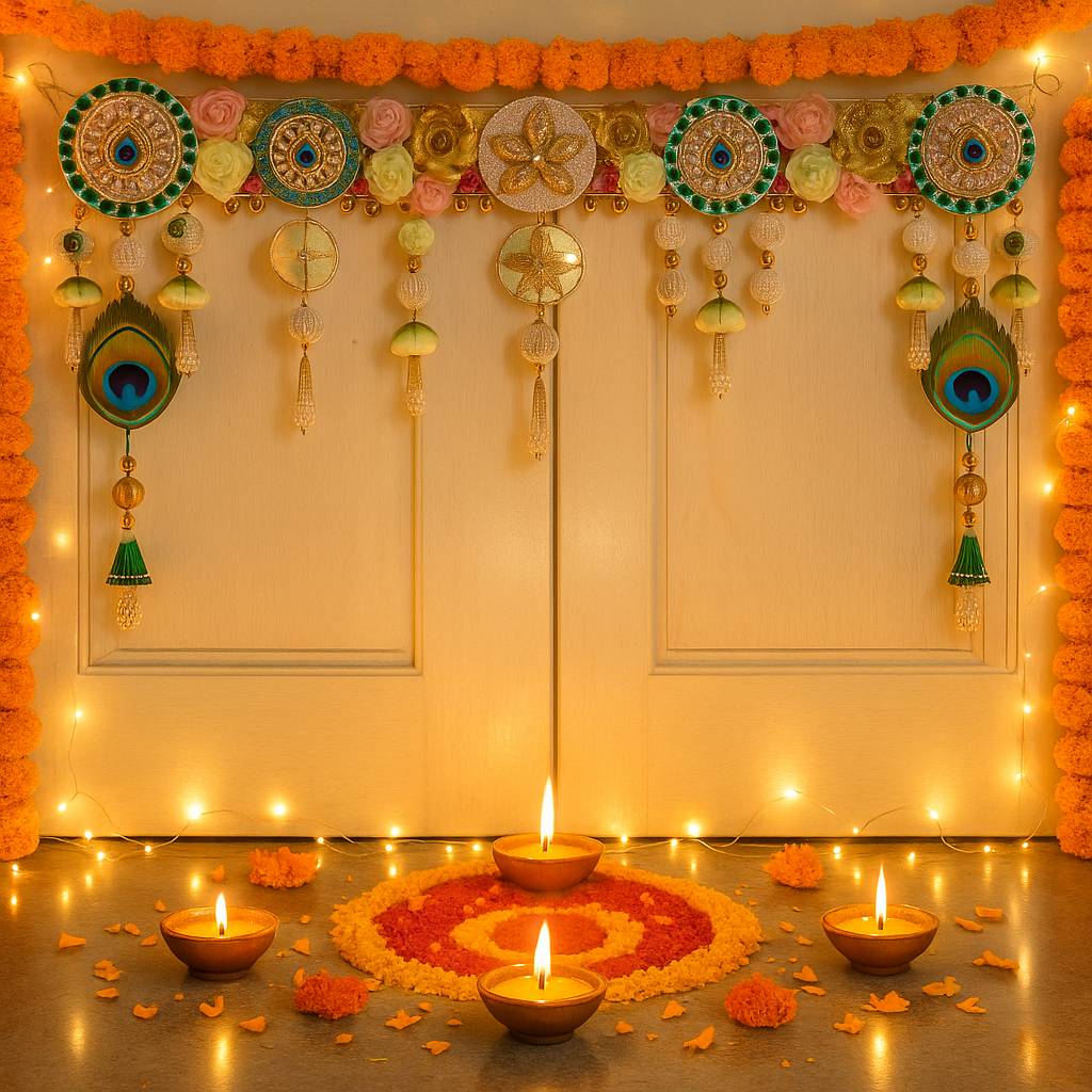 • For Festivals like Diwali & Navratri – Use vibrant floral or artificial flower Torans.