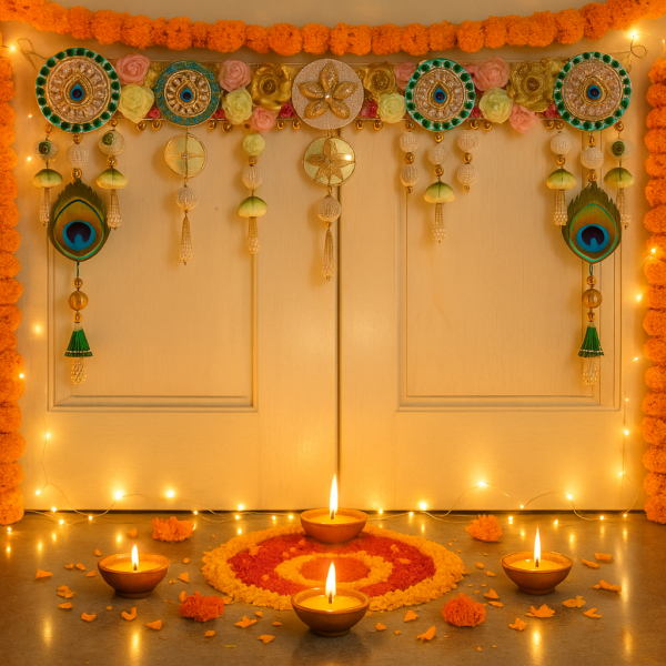 • For Main Door Decoration – Opt for a grand beaded or embroidered Toran with traditional designs.