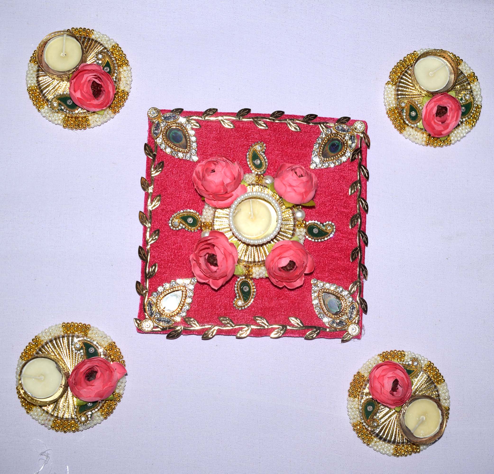 The chowki plate, with its velvet maroon base and pearl-studded borders, is surrounded by intricate floral and paisley patterns, symbolizing prosperity and positivity. The golden center holder is ideal for placing a diya, tealight, or small kalash, making it the spiritual centerpiece of your decoration. The 4 matching tealight holders feature mini floral embellishments with pearls, mirrors, and beads, creating a harmonious festive look when placed around the chowki.