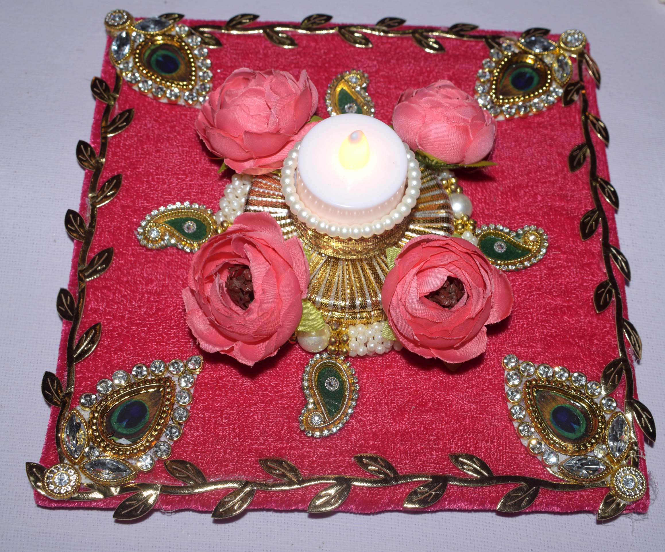 Handcrafted by skilled artisans, every detail of this chowki reflects dedication and artistry. The combination of velvet, zari, pearls, and floral motifs adds a luxurious and royal look, making it stand out from ordinary pooja décor items.