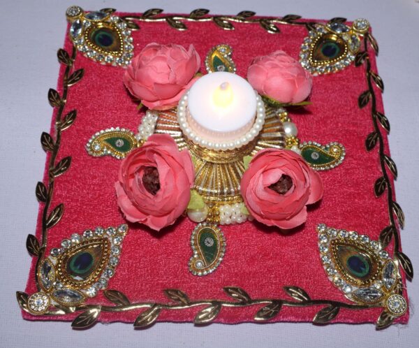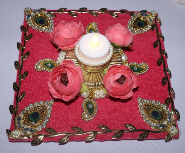 The chowki plate, with its velvet maroon base and pearl-studded borders, is surrounded by intricate floral and paisley patterns, symbolizing prosperity and positivity. The golden center holder is ideal for placing a diya, tealight, or small kalash, making it the spiritual centerpiece of your decoration. The 4 matching tealight holders feature mini floral embellishments with pearls, mirrors, and beads, creating a harmonious festive look when placed around the chowki.